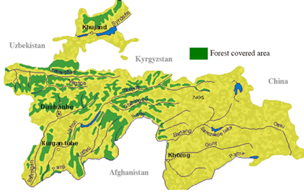 Tajikistan is a mountainous country in Central Asia. Forests cover 3-3.5% of Tajikistan’s area. The total area of the State Forest Fund is 1.8 million ha. The area covered by forests is about 410 000 ha. All forests are State property. It is possible for private persons to establish private woodlots on private farmland.